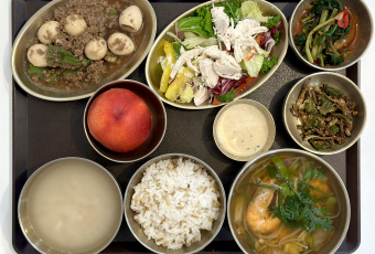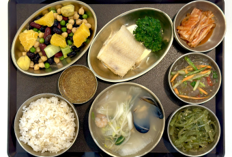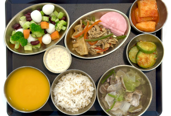 점심메인 : 돈안심뿌리채소볶음 / 밥(죽) : 콩나물소고기밥&양념장국(탕) ..