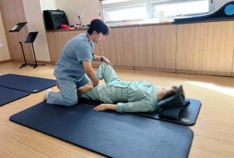 매트 위에서 스트레칭 운동치료를 진행했습니다. 침상이 아닌 바닥 매트를 사용해 몸의 긴장을 풀고, 자세 안정과 유연성 향상..