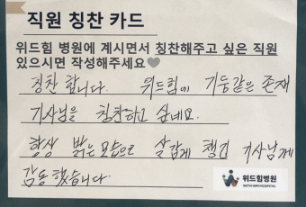 7월 한달동안 환자분들께서 적어주신 직원 칭찬카드입니다.저희 위드힘병원의 각 부서 모든 직원분들은환자분들과 함께 기도하는 ..