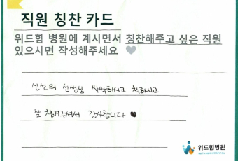 11월 한달동안 환자분들께서 적어주신 직원 칭찬카드입니다.저희 위드힘병원의 각 부서 모든 직원분들은환자분들과 함께 기도하는..