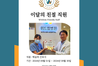 환자분들께서 뽑아주신 9월, 10월 위드힘 병원에 친절 직원을 소개합니다.◆ 9월 친절직원 백송하 간호사선생님병동..